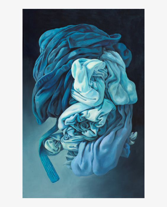 Hülle und Falten sind ein zentrales Thema im Werk von Alina Kunitsyna. Mit großer Wirkungsästhetik verwandelt sie mit Hilfe von Licht, Raum und Farbe banale Dinge aus dem Alltag in Objekte von eleganter Schönheit. Detailreichtum und dekorative Drapierungen rücken das ursprüngliche Gewicht und die Dichte eines Wäschebündels in den Hintergrund, Grenzen zwischen Raum und Wirklichkeit verschwimmen und das Auge glaubt, ein beseeltes Wesen wahrzunehmen, das strahlend und graziös der irdischen Schwere zu entschweben scheint.