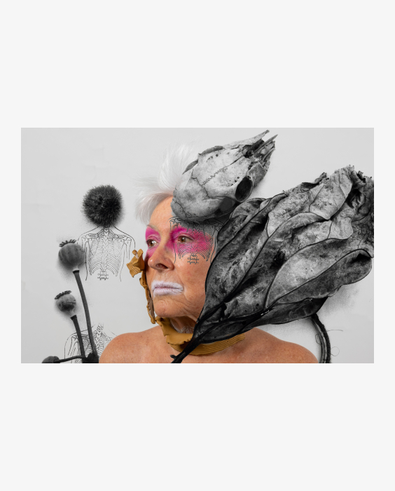 Margot Pilz ist eine Pionierin der Medienkunst und arbeitet seit den 1970er Jahren konzeptuell und experimentell im Bereich Fotografie, Video und Performance. Ihre Arbeiten sind stets von einem feministischen Ansatz geprägt, wie sie sich auch immer in der Frauenbewegung engagiert hat. Ein großer Teil ihrer Arbeiten besteht aus Selbstportraits. Der Selbstauslöser ist für die Künstlerin zu einem Mittel geworden, welches männliche Dominanz eigenverantworteten Bilder entgegenzusetzen versucht. Transition ist eine spätere Arbeit der Künstlerin, in der sie viele Accessoires einbringt, um ihre Anliegen zu verstärken und auch malerisch zu demonstrieren. Das Gesicht ist bemalt und getrocknete Pflanzen wie Mohnkapseln sowie Wandzeichnungen zeichnen ein komplexes und rätselhaftes Bild eines Übergangs, dies spiegelt sich auch im Titel wider. Eine der auf 6 Editionen limitierte Arbeit war 2023 in der Ausstellung „TOUCH NATURE“ im Austrian Culture Forum New York zu sehen.