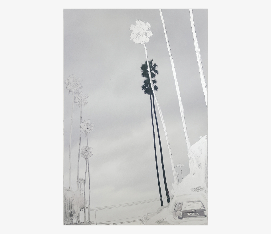 Peter Klare’s works Tire Center (2017) and 3rd and St. Anderson (2017) form part of the artist’s comprehensive ‘Silver’ group of works in which he repaints urban and landscape photography and creates new scenes through the interplay between photography and painting which reflect the theme of perception by combining the two different image realities. The large-scale overpainting work focuses on colours and painting styles characteristic of each location and reduces the original detailed photographs down to what Peter Klare considers to be the most significant aspects. The works are developed on brightly coloured surfaces on highly magnified and grainy copies of the photo which opens up new scope for the imagination and yet guides us back to the original.