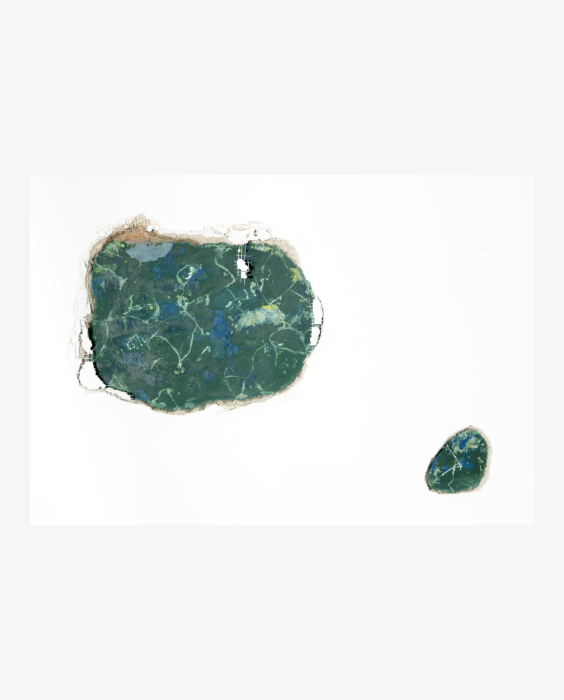 One of the walls in the entrance area of the Kunsthaus Kollitsch, a listed building, is adorned with two round-shaped, dark green spots, not definable at first view. They are part of the site-specific installation Spots (2021) by Alfredo Barsuglia and pretend to be a recently uncovered wall decoration, a relic from times long gone, made from green marble (serpentinite). However, upon closer view, it becomes apparent that the marbled pattern doesn’t stem from real marble and is certainly not old. The artist thus creates the illusion of an imitation and draws attention to the building’s history at the same time.